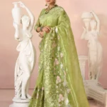 Embrace nature’s elegance with this stunning light green saree featuring elaborate white and pink floral embroidery. Perfect for daytime events and weddings.